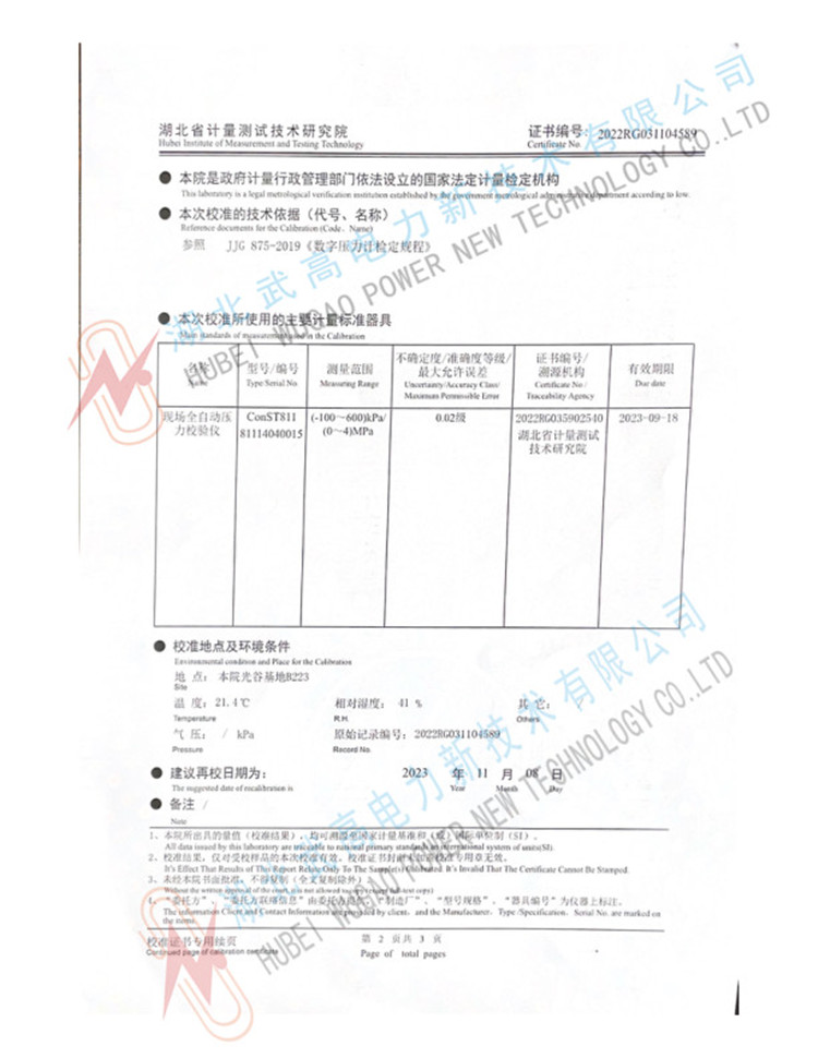 2.常溫氣體壓力表:0~1MPa任意壓力點校驗